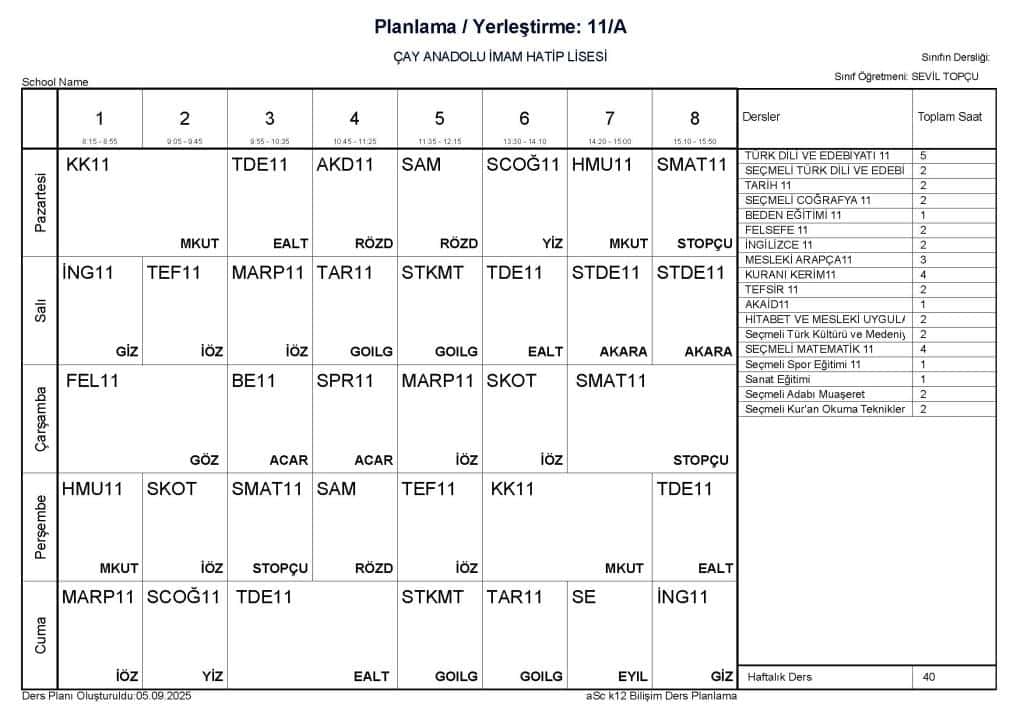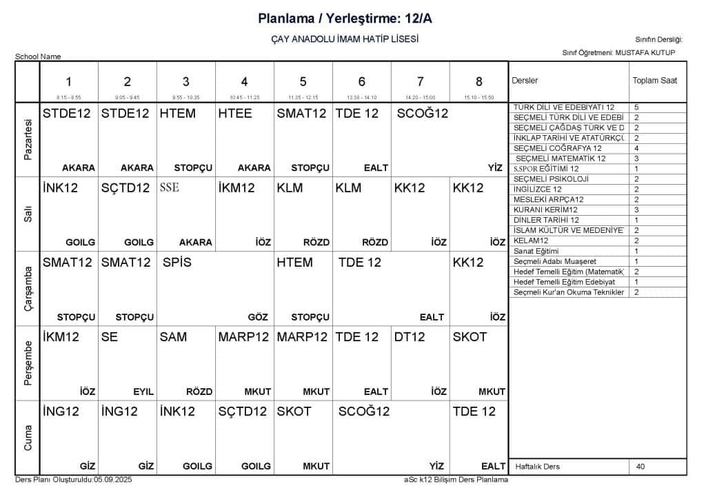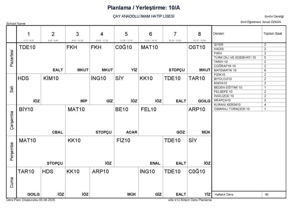 08 Eylül 2025 tarihinden geçerli ders programımız